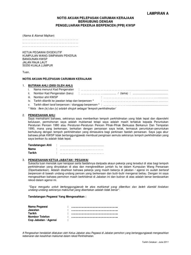 Notis Akuan Pelepasan Caruman Kerajaan Berhubung Dengan Pengeluaran Pekerja Berpencen Ppb Kwsp